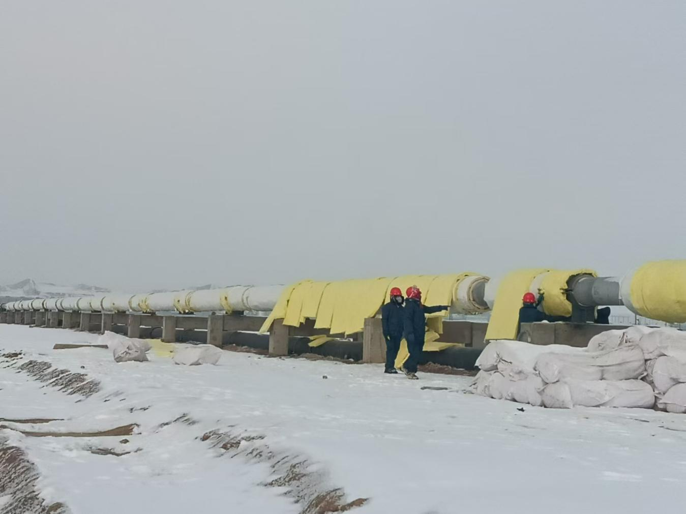 入冬以来的第二场雪,使得项目建设的难度达到新的高度。面对昼夜零下十几度的严峻天气考验,现场施工队伍决定在管道基础制作期间,采用混凝土分段浇筑的方式有序施工。白天气温相对高的时候进行浇筑,每段浇筑完成后及时搭设保温棚,夜间在保温棚内部生火,避免混凝土受冻,确保其强度达到要求。