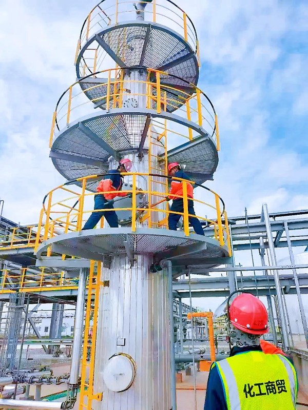 “高处作业的防范措施有哪些?碱液卸车前准备要做到哪些?监护人员的责任是否熟知……”10月4日,在化工园区物流园货场各个施工现场,mansion88明升化工商贸公司值班领导及技术人员来到施工现场,进行例行巡检。