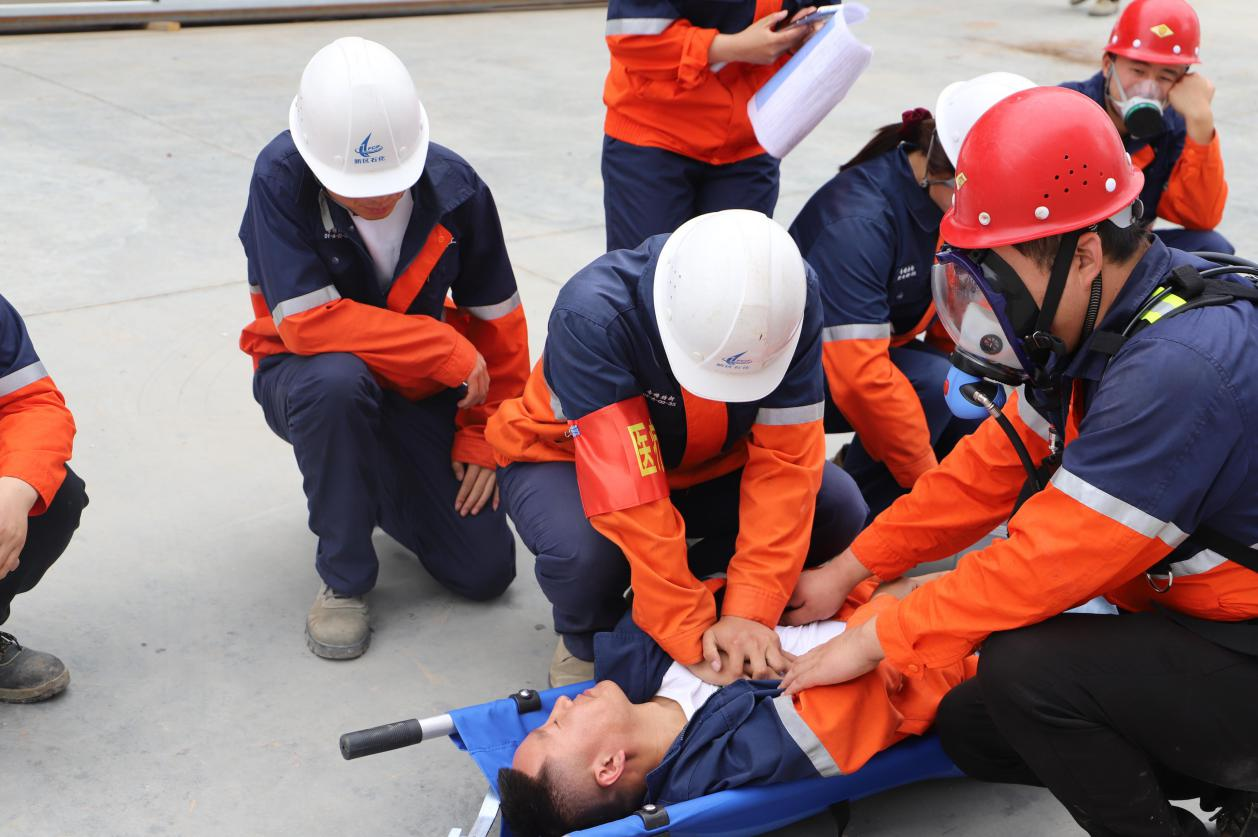 演练从实战出发,现场总指挥刘鹏宣布启动专精特新公司泄漏中毒应急预案后,各应急救援立即展开行动:现场保卫组立即进行人员疏散和现场警戒、后勤保障组携带应急救援物资迅速抵达现场随时准备补给救援物资、医疗救护组第一时间将中毒受伤人员经过简单救护后送至救护车、通讯保障组调试所有通讯设备保证救援过程通讯畅通、事故抢险组戴空气呼吸器,身穿重型防化服携带堵漏工具在现场利用氯气捕消器,水幕水带、专业堵漏工具等进行抢险处置……救援人员各司其职,各环节有条不紊、井然有序。经过20分钟的排险、喷淋,氯气泄漏成功处置,环境检测空气正常,演练结束。