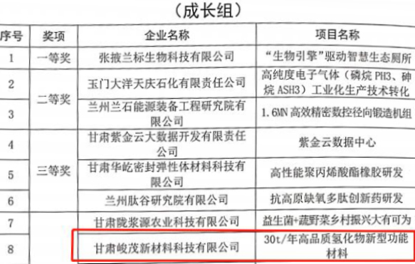 近日,从第十一届中国创新创业大赛(甘肃赛区)组委会获悉,兰州新区专精特新化工产业孵化基地的两家入驻企业——甘肃峻茂新材料科技有限公司和兰州昱重医药科技有限公司分别荣获第十一届中国创新创业大赛(甘肃赛区)优秀企业奖。