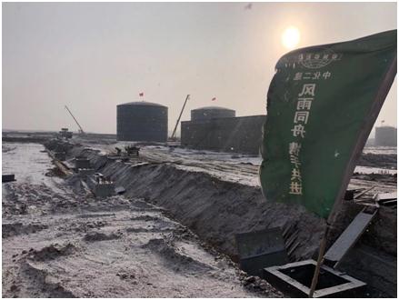 物流园货场项目现场各个储罐、基础配套设施屹立在风雪中蔚为壮观印有“风雨同舟,携手共进”的彩旗迎风飘扬;施工现场电焊弧光闪烁点燃着建设者的激情;施工人员手持图纸,认真指导每一道施工工序。该项目蒸汽管线和地下官网工程建设硝酸罐安装工作、廊架钢结构预制办公楼内部装修工作均按期推进。